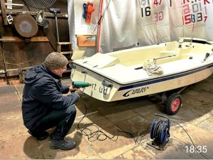 Trotz des regnerischen Wetters trafen sich am heutigen Samstag etliche freiwillige Helfer, um die beiden kürzlich von Steffen gekauften Jollen für die Segelsaison vorzubereiten. Die Ausreitgurte mußten genäht werden. Auch wurden die bisherigen Namen entfernt und zwei uralten Zugvögel ausgeschlachtet, sodass sie jetzt entsorgt werden können. Zu Mittag gab es Linseneintopf.