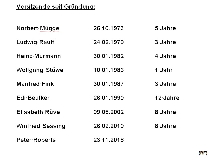 05.05.2018 Ausscheiden des 1. Vorsitzenden, Winfried Sessing und des Geschäftsführers, Reinhard Feld, Wahl von Georg Dlugay zum neuen Geschäftsführer, Funktion des 1. Vorsitzenden bleibt unbesetzt.